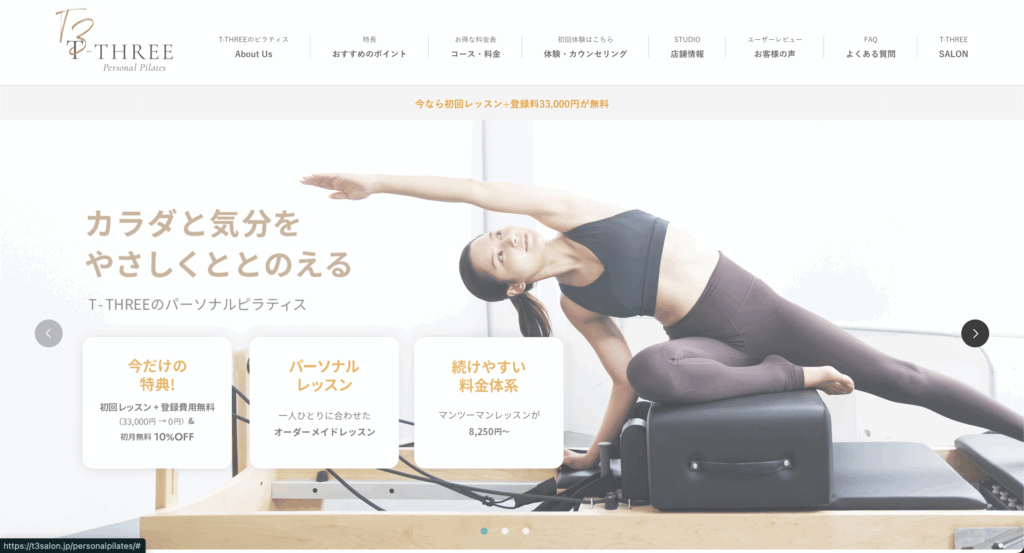 月8回プラン66,000円公式サイト https://t3salon.jp/personalpilates/studio/jiyugaoka/