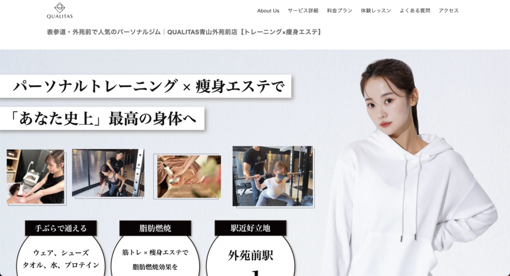 QUALITAS 青山外苑前店 は、トレーニング・痩身エステ・食事指導・セルフトレーニングを組み合わせた「鍛える × 流す × 燃やす」を一度に実現するハイブリッド型パーソナルジムです。